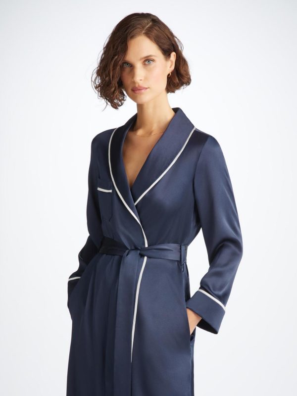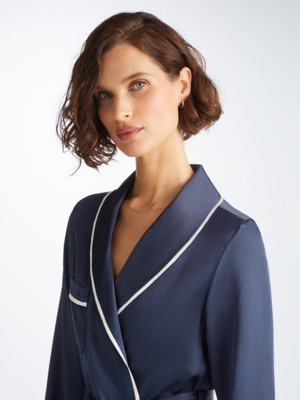 To care for your Bailey Silk Satin Navy Women’s Long Dressing Gown please be aware of the following care considerations: