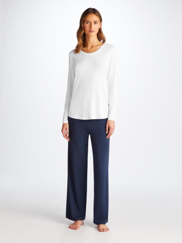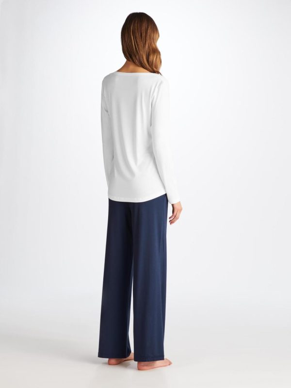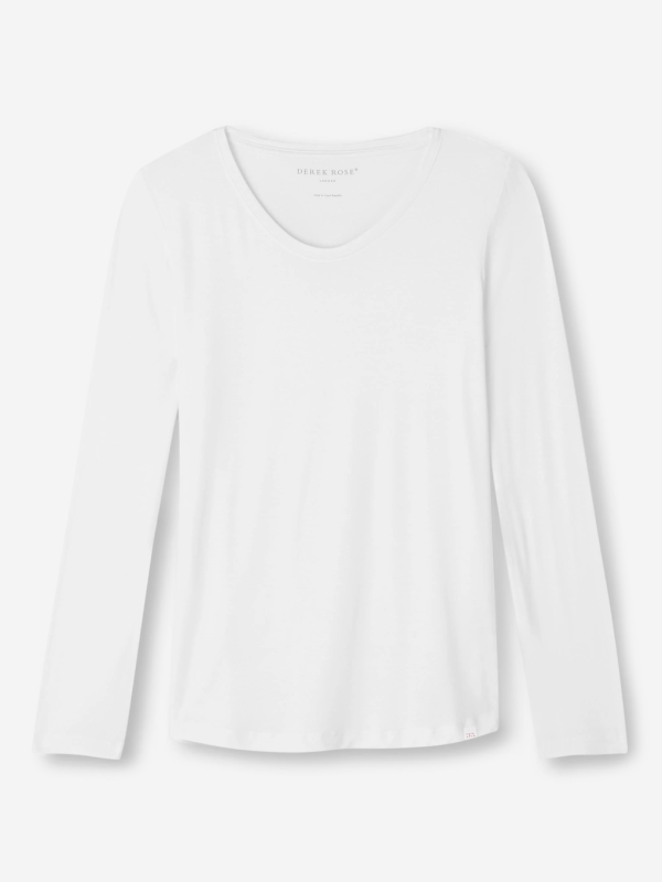 Our crisp white Lara long sleeve top has a relaxed but flattering shape with a curved, loose hem and offers a comfortable and natural fit allowing free movement. Fashioned from our signature soft micro modal which will retain its white colour wash after wash.|
