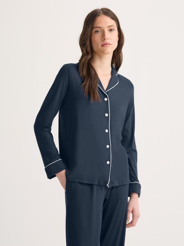 Combining a comfortable and flattering shape with intricate details, our navy Lara women’s pyjamas will keep you looking great and feeling comfortable throughout the seasons.