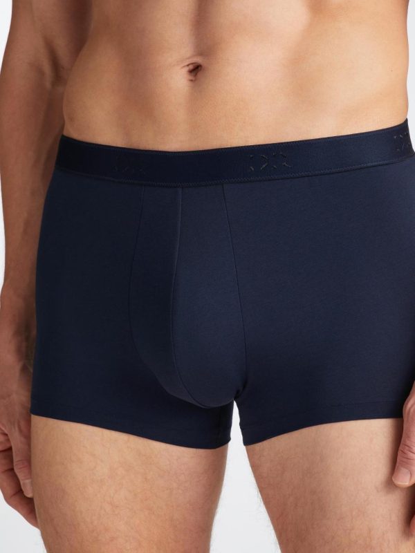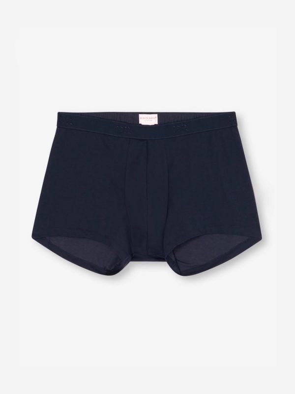 Our Jack boxer briefs in navy are cut for a streamlined, classic look with a fitted hipster shape, closed front and a shorter leg. A fabric-covered waistband provides gentle skin contact.
