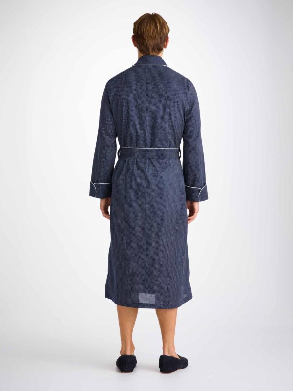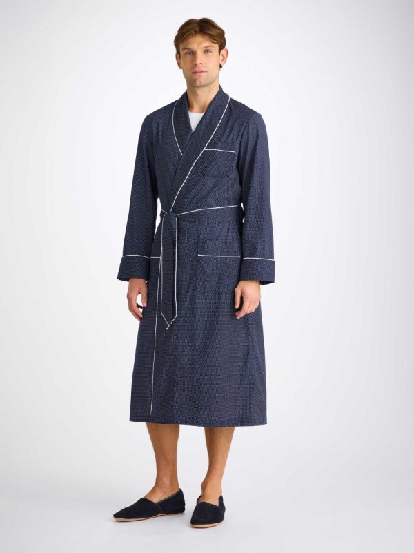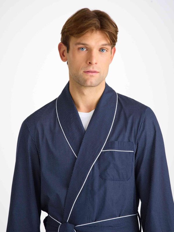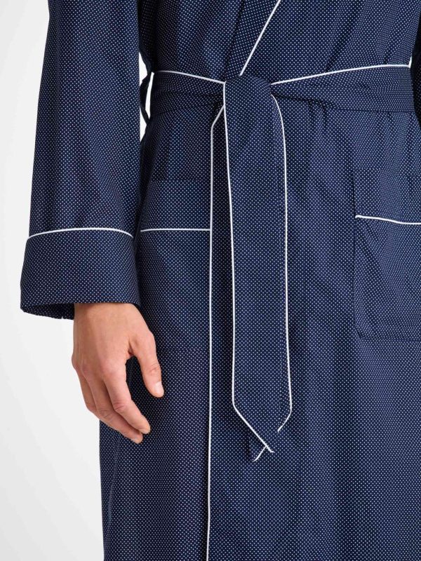 The Plaza dressing gown is crafted from our extra lightweight and breathable pure cotton batiste fabric with a printed navy and white spot motif finish.
