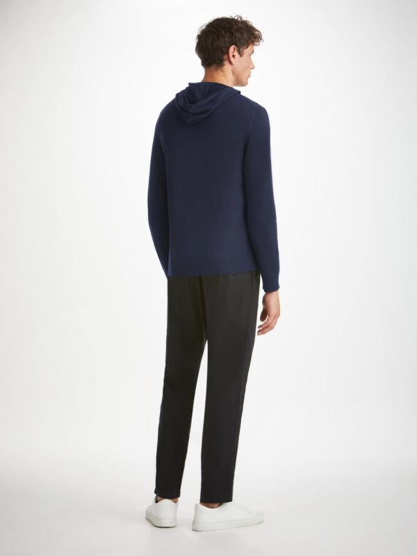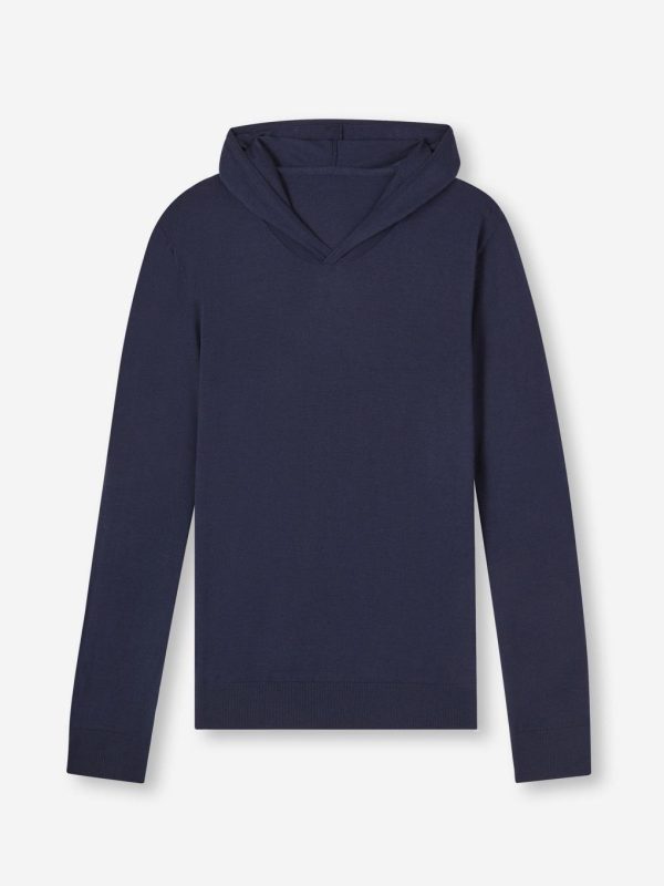 Designed with 100% merino wool, our Orson navy hoodie has been created with a ribbed neckline and cuffs as well as a practical hood.|