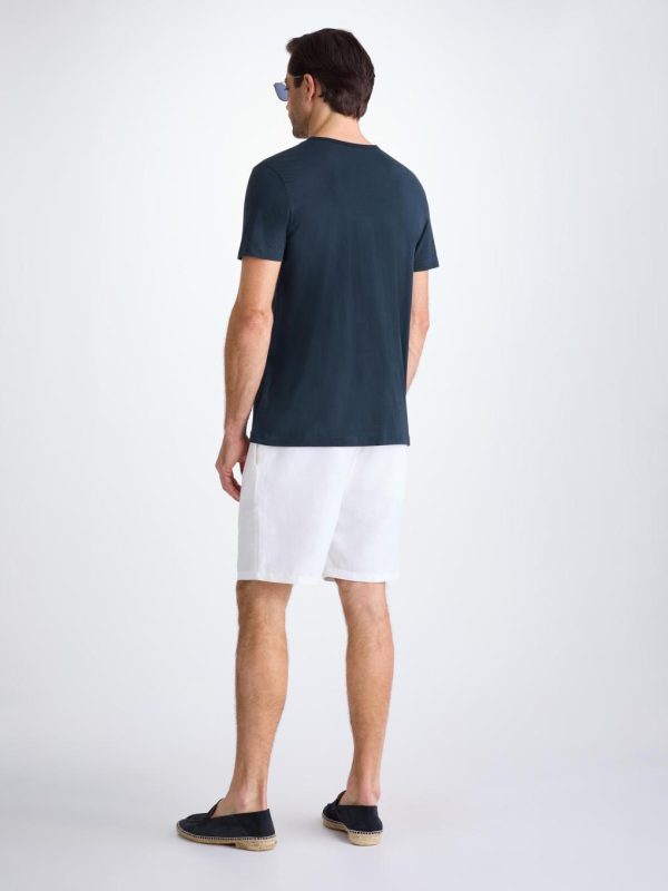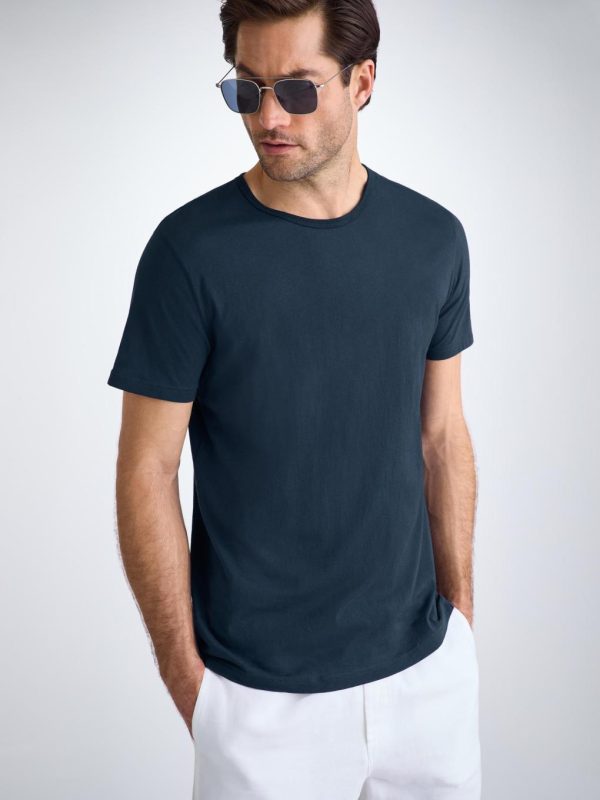 Our navy blue Riley crew-neck t-shirt is cut from 100% fine gauge Pima cotton for a luxurious essential. It’s superior to standard cotton thanks to the extra-long staple fibres which produce a more refined and silkier touch. These unique properties also ensure the fabric won’t twist or pill and the vibrant colour lasts, wash after wash.