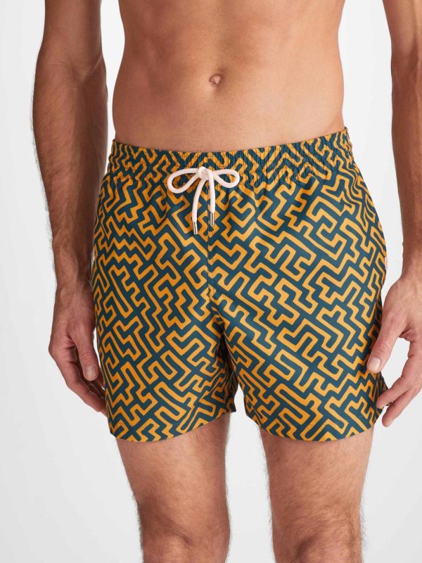 Designed for a relaxed look, our classic style swimming trunk has a fully elasticated waistband and drawstring tie for the perfect fit. The braided drawstring ends are complemented with metal aglets for a luxe finish and the back of the swim shorts feature matching metal eyelets for easy air and water drainage. Covered in a teal geometric print inspired by the Labyrinth in the Greek myth of Theseus and the Minotaur.|