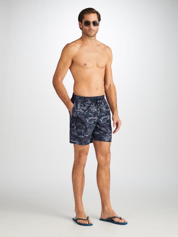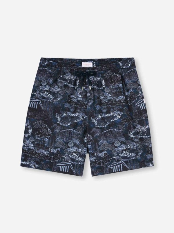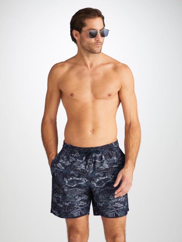 Designed for a relaxed look, our Poseidon print inspired by wave shapes is seen in teal and navy tones. This classic style swimming trunk has a fully elasticated waistband and drawstring tie for the perfect fit. The braided drawstring ends are complemented with metal aglets for a luxe finish and the back of the swim shorts features cotton-stitched eyelets for easy air and water drainage.|