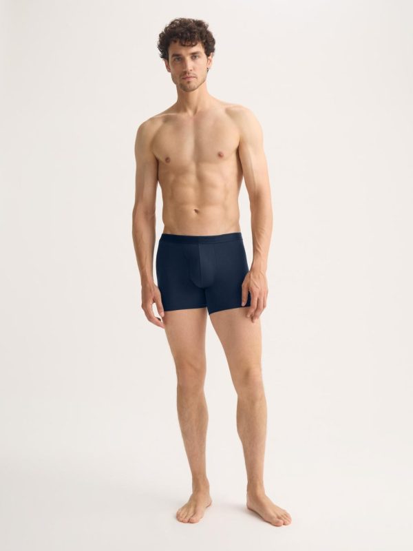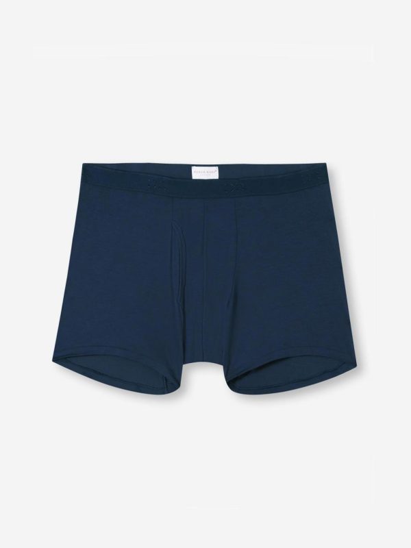 Our navy Alex trunks are cut for a streamlined, classic look with a fitted shape, classic open front and a longer leg. A fabric-covered waistband provides gentle skin contact.